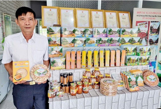 Ông Bùi Văn Chương, Giám đốc HTX Tân Lợi Phát với những sản phẩm đạt chứng nhận OCOP của HTX