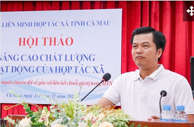 Đại diện HTX Ba khía Đầm Dơi chia sẽ kinh nghiệm chuyển đổi số của HTX trong đó có tổ chức livestream tại Hội thảo của Liên minh Hợp tác xã tỉnh