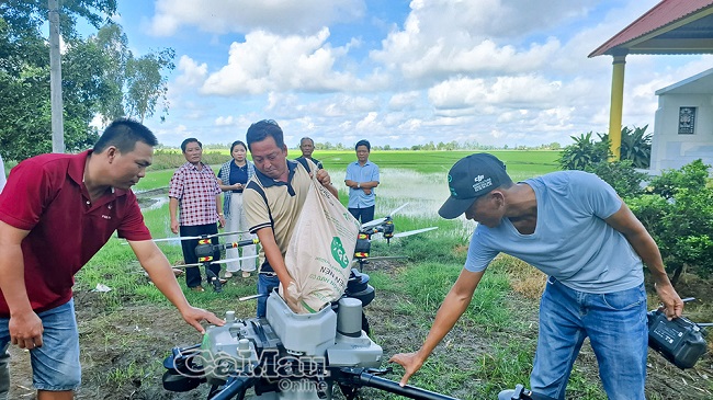 Nông dân ấp Tường Thắng A (xã Vĩnh Thanh) sử dụng phân hữu cơ trong sản xuất lúa