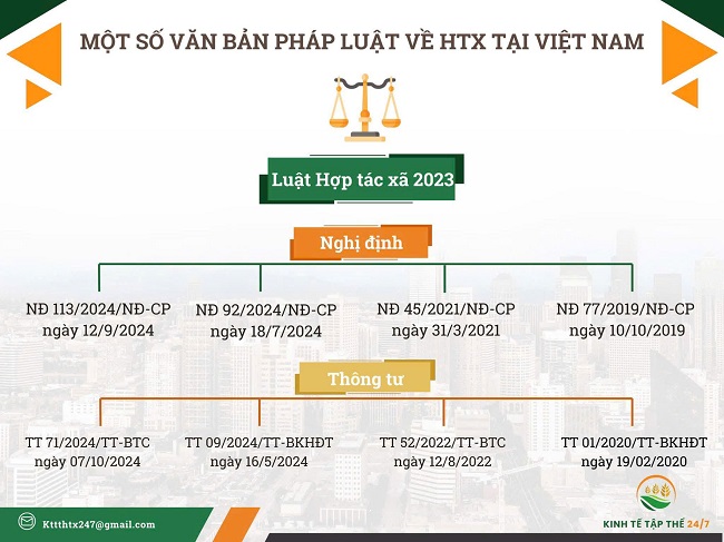 Bên cạnh đó, các văn bản hướng dẫn thi hành Luật Hợp tác xã năm 2023 được ban hành, bao gồm: Nghị định số 113/2024/NĐ-CP, ngày 12/9/2024 quy định chi tiết một số điều của Luật hợp tác xã; Nghị định số 92/2024/NĐ-CP, ngày 18/7/2024 về đăng ký tổ hợp tác, Hợp tác xã, Liên hiệp Hợp tác xã; Thông tư số 09/2024/TT-BKHĐT, ngày 16/5/2024 ban hành biểu mẫu thực hiện thủ tục đăng ký tổ hợp tác, Hợp tác xã, Liên hiệp Hợp tác xã và quy định về nội dung thông tin, việc cập nhật, khai thác và quản lý Hệ thống thông tin quốc gia về hợp tác xã. Bộ Tài chính đã ban hành Thông tư số 71/2024/TT-BTC, ngày 07/10/2024 về hướng dẫn chế độ kế toán Hợp tác xã, liên hiệp HTX. Đến nay, hệ thống pháp luật các văn bản hướng dẫn theo yêu cầu của Luật Hợp tác xã năm 2023 đã được ban hành đầy đủ, đúng quy định, góp phần đưa các chính sách hỗ trợ đồng bộ của Luật đi vào cuộc sống, thúc đẩy các tổ chức kinh tế tập thể phát triển.
