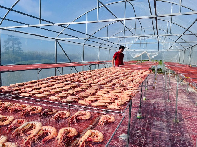 Quan cảnh phơi tôm khô của HTX Ba Khía Đầm Dơi