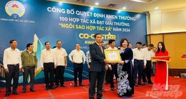 Ông Trịnh Văn Cường thay mặt HTX nhận danh hiệu “Ngôi sao hợp tác xã” năm 2024 từ Chủ tịch Liên minh Hợp tác xã Việt Nam