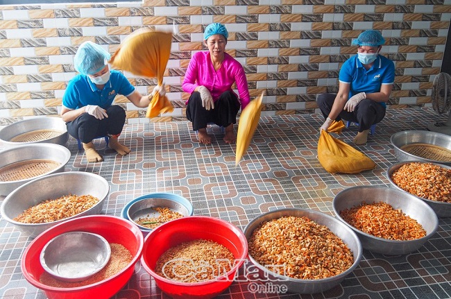 Nghề làm tôm khô truyền thống tại cơ sở tôm khô Ngọc Giàu (xã Tân Tiến).