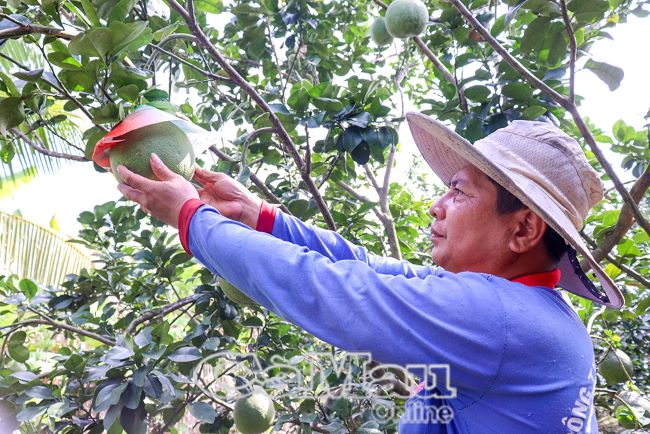 Gắn bó với cây bưởi da xanh ruột hồng từ nhiều năm nay, gia đình anh Lâm Văn Việt là một trong những hộ trồng bưởi lâu năm của HTX. Hiện vườn bưởi của anh có hơn 300 gốc đang cho trái. Từ sáng sớm, vợ chồng anh đã có mặt ngoài vườn, cần mẫn tưới nước, tuyển trái, che nắng từng quả bưởi để trái phát triển đồng đều, đạt mẫu mã đẹp khi ra thị trường Tết.