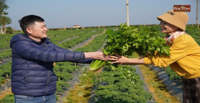 Các sản phẩm HTX Nông Xanh: Cải xoăn, quả đậu Hà Lan, cần tây ép nước được phân phối tại hệ thống Bác Tôm & Farms.