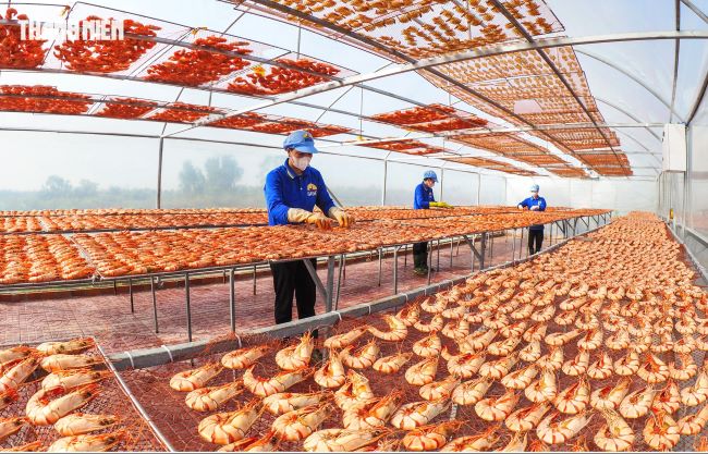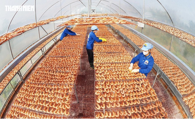 Tôm sú khô được phơi trong nhà màng khép kín, kiểm soát vệ sinh nghiêm ngặt, giúp sản phẩm khô đều, giữ màu đẹp ẢNH: G.B