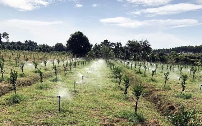 Tưới tự động tại một nhà vườn trồng quýt ở xã Xuyên Mộc. Ảnh: Đông Hà