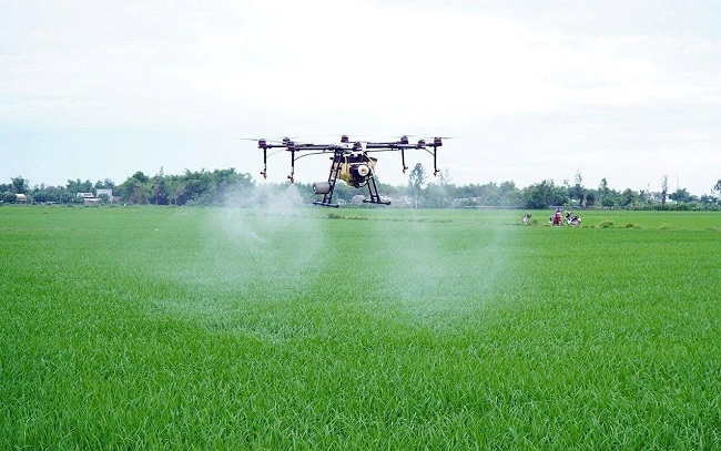 Mô hình phun thuốc bảo vệ thực vật bằng máy bay hiện đang sử dụng cho các HTX trồng lúa ở xã Long Điền, TP.HCM. Ảnh: Song Anh