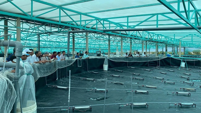 Mô hình nuôi tôm siêu thâm canh bằng hệ thống lọc nước tuần hoàn khép kín trong nhà màng tại HTX Quyết Thắng (phường Long Hương, TP.HCM). Ảnh: Song Anh
